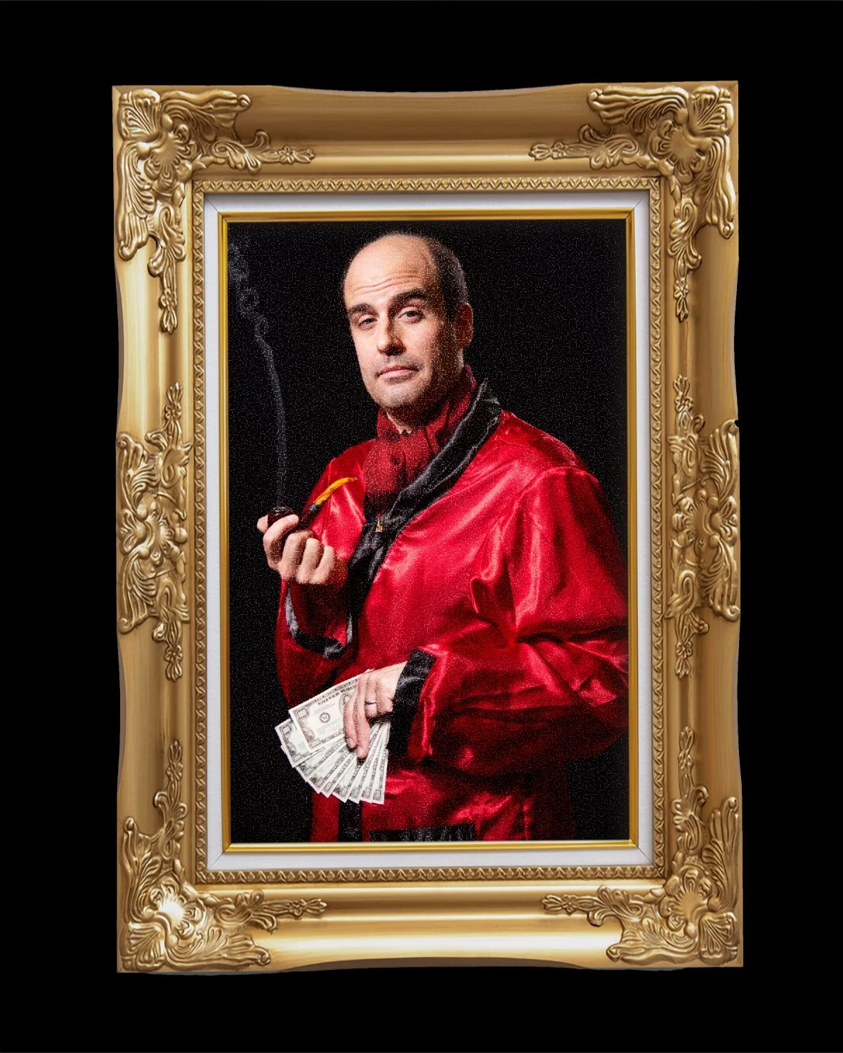 When we created the portrait for the play, we had a blast doing it. My talented friend Alvaro played Mr. Hensley, and he completely nailed the role. He understood the character’s mix of arrogance and insecurity and made Mr. Hensley leap right off the stage. To complete his look, I bought a “Hugh Hefner” costume from a Halloween store—complete with a smoking jacket, ascot, and pipe. We even used fake $100 bills and took inspiration from Blue Öyster Cult’s Agents of Fortune album cover. Later, we added a subtle digital drift of smoke to the image for a finishing touch.
